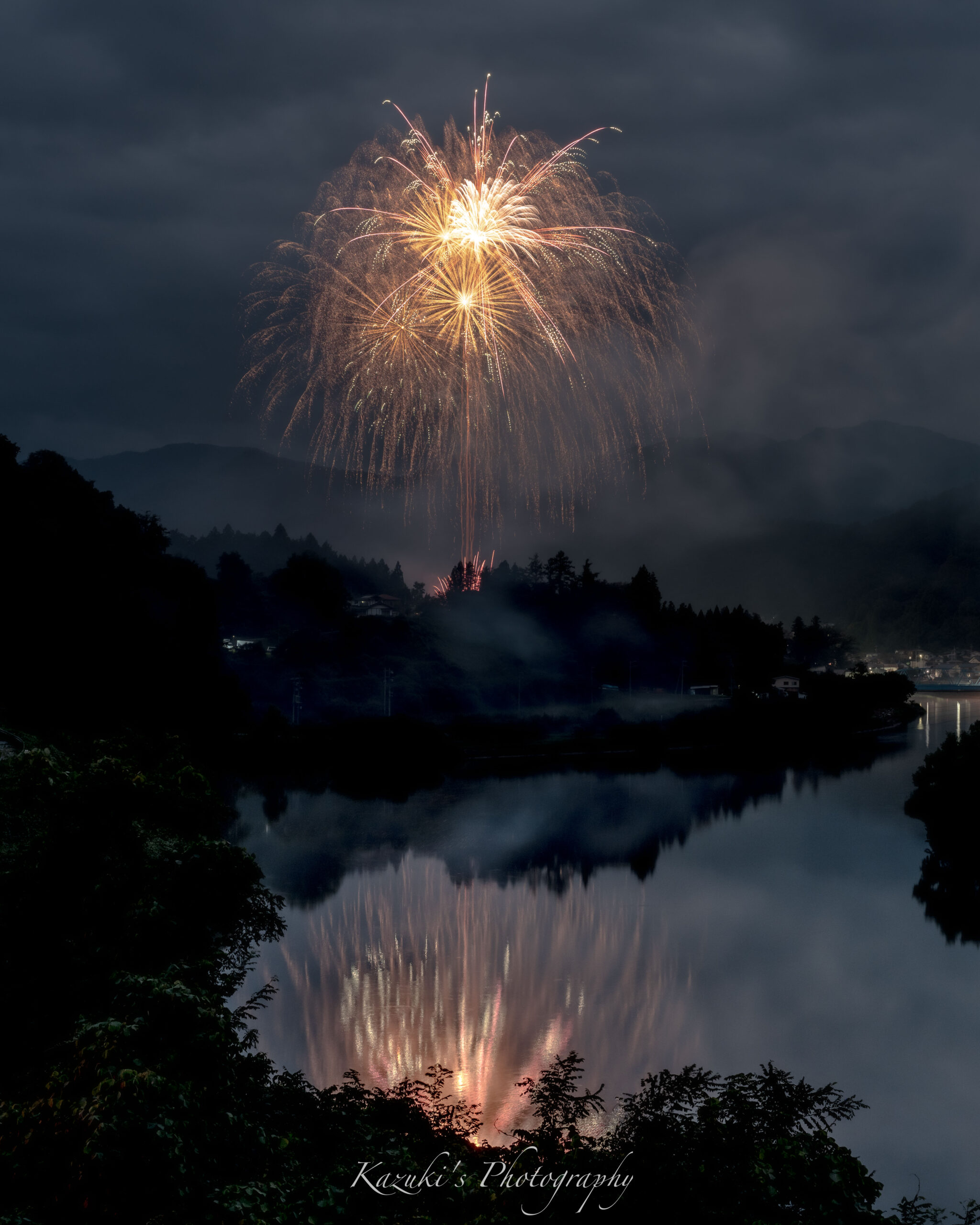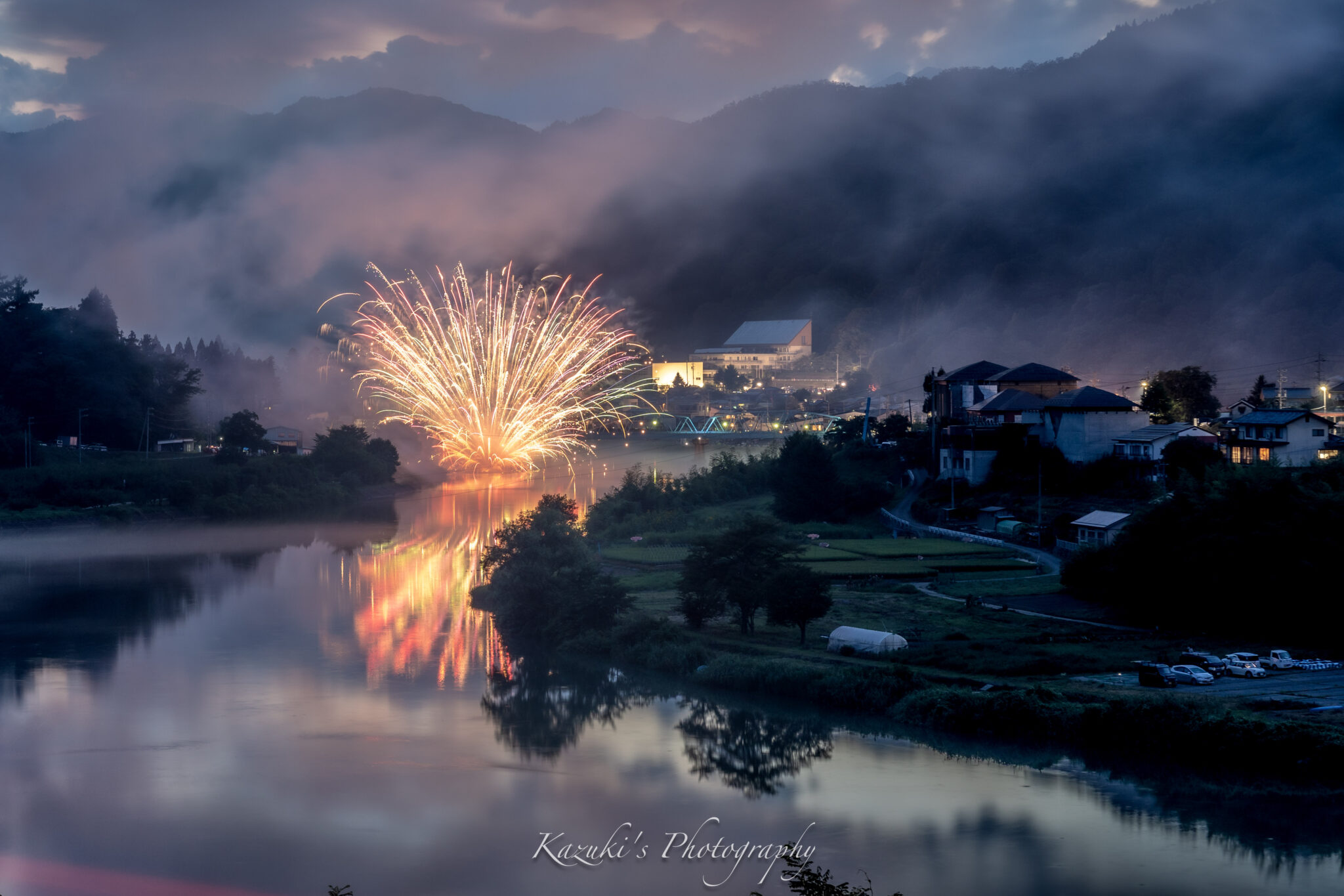 山間部を流れる犀川に映り込む非常に美しい打ち上げ花火。その後にドーンと鳴り響く反響音はとても迫力があり、ここでしか体験できないイベントとなります。