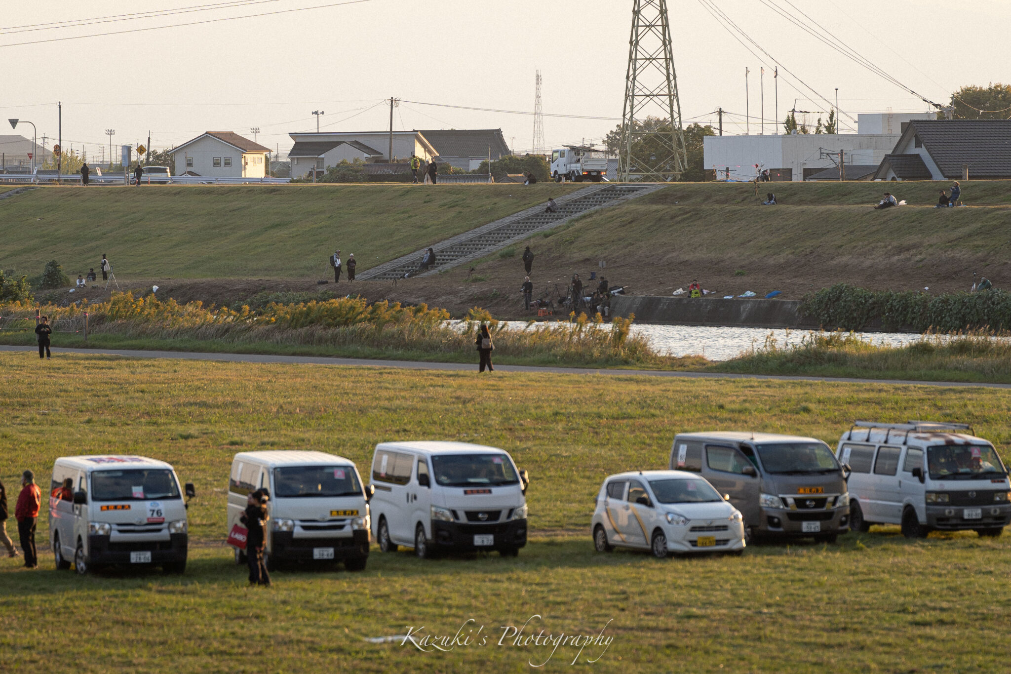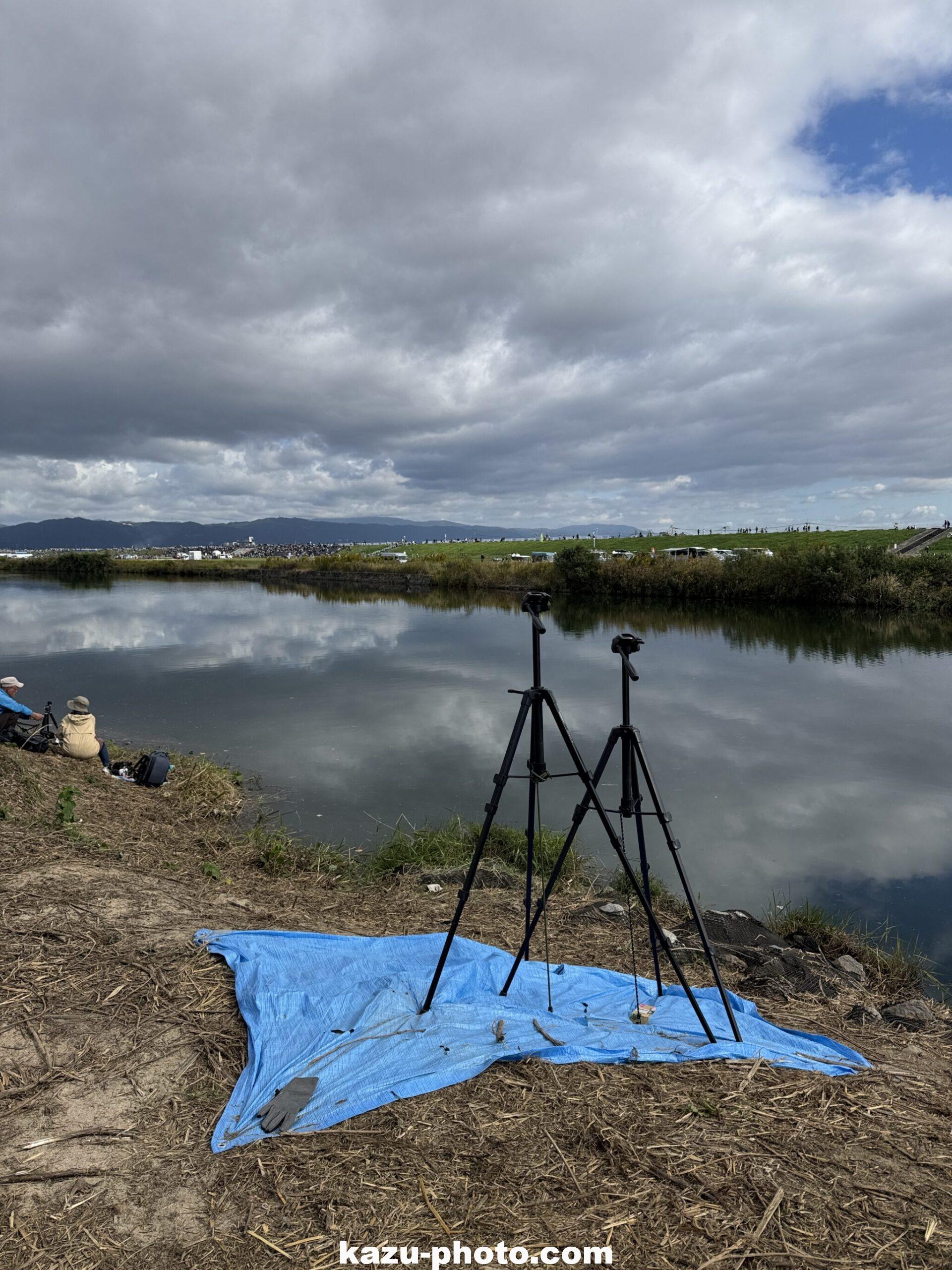ここで日中の撮影を終えて、午後には会場に行ってみる事にしました。そして、日没ごろ、会場からたまたま対岸を見てみると、なんと三脚で場所取りしたカメラマンが戻って来ている様子が写っていました。その様子を全公開します!!