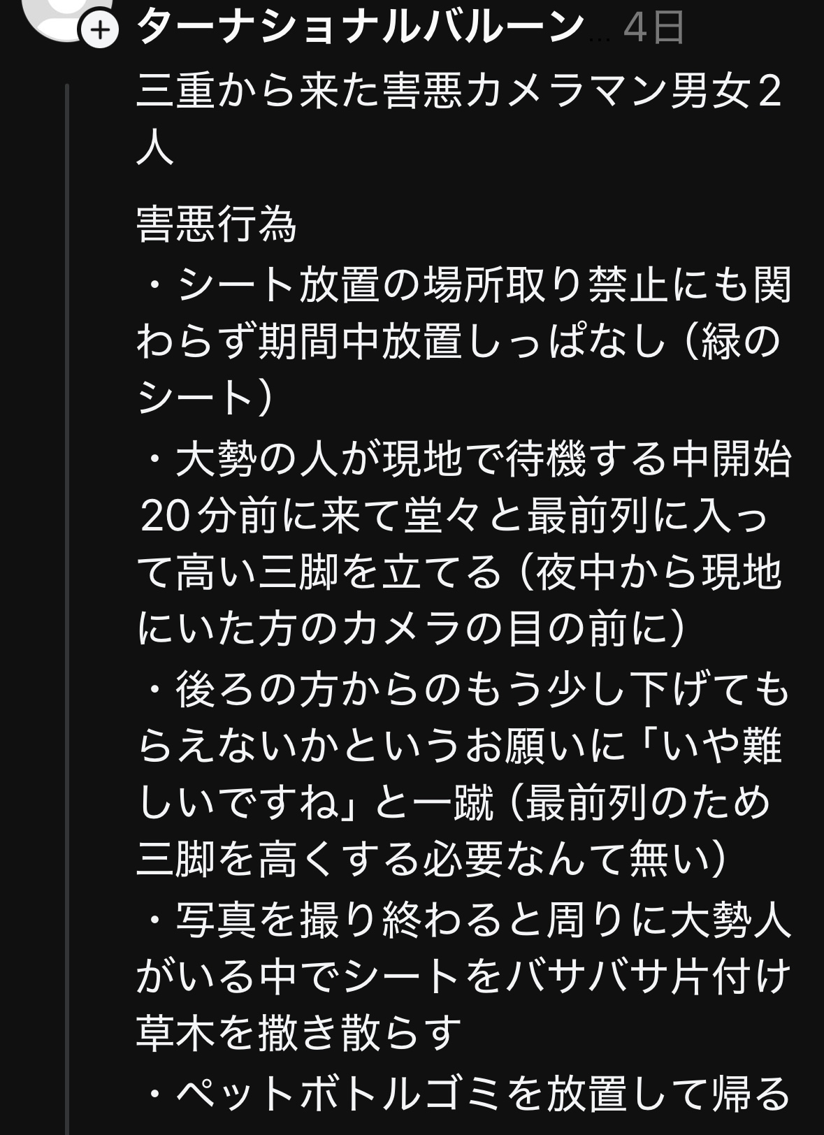 と言うのも、国内外を含めて写真撮影や旅行をする身として、類似した対人のトラブルや事例は多々ありました。しかし、今回は特定のカメラマンの行動があまりに酷く、なんとか改善・対策・当人が反省してくれないかと言う思いがあります。
