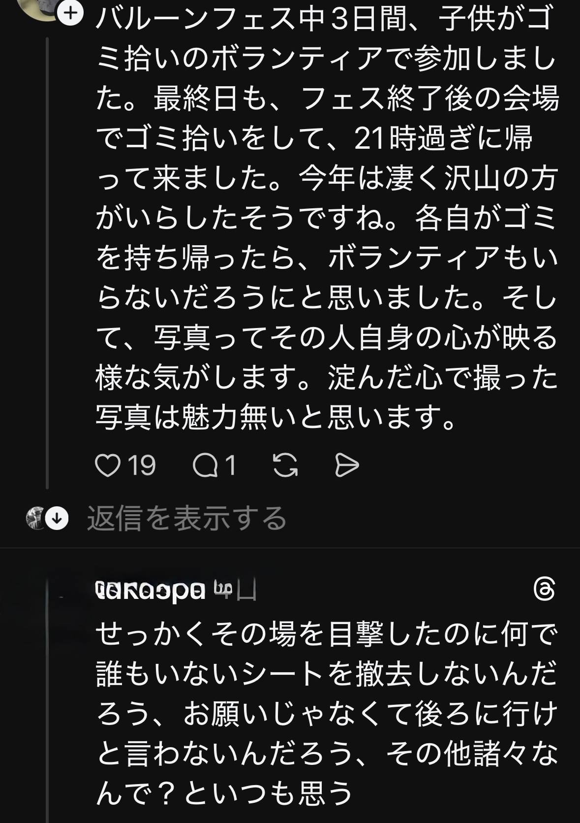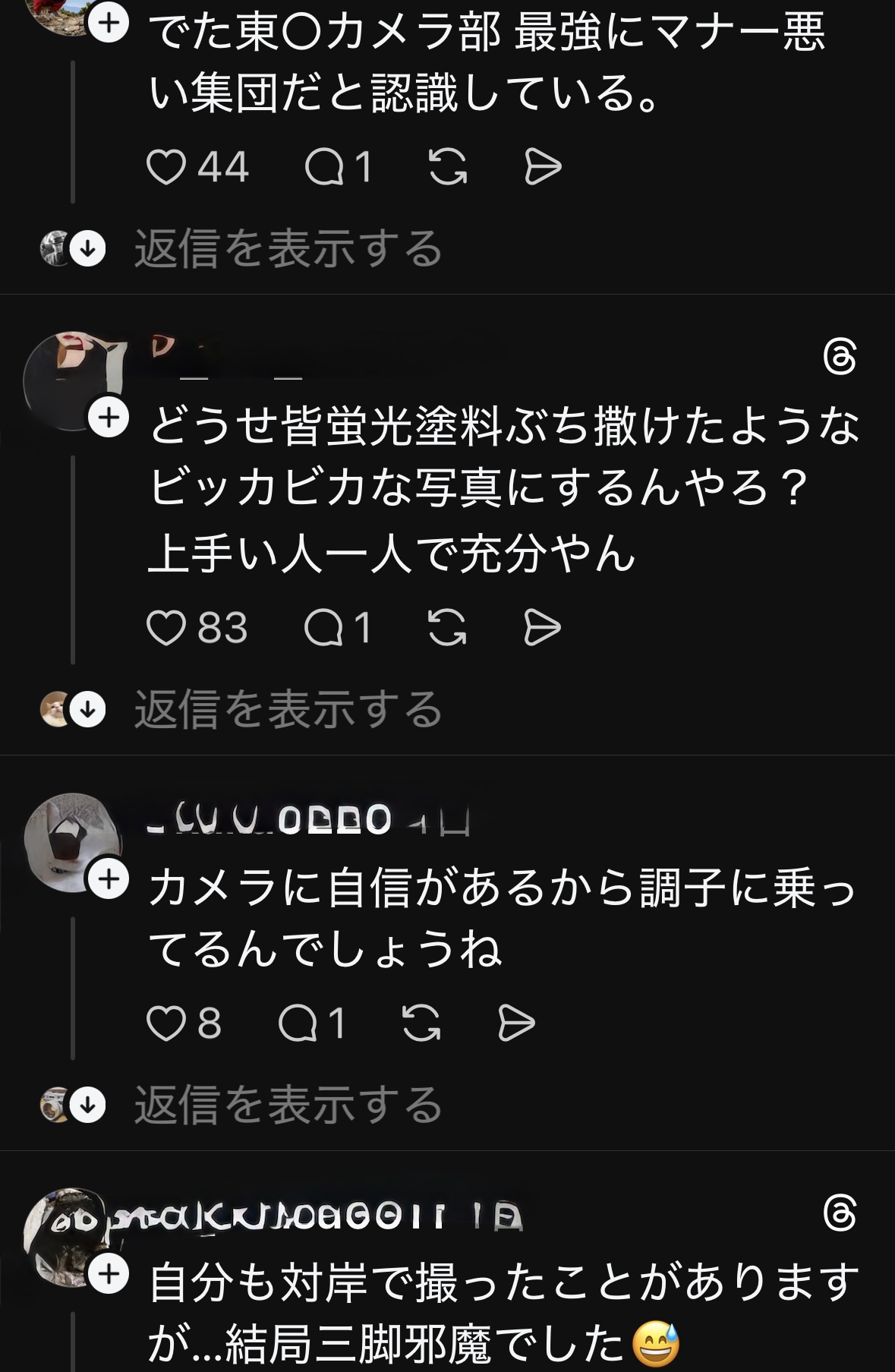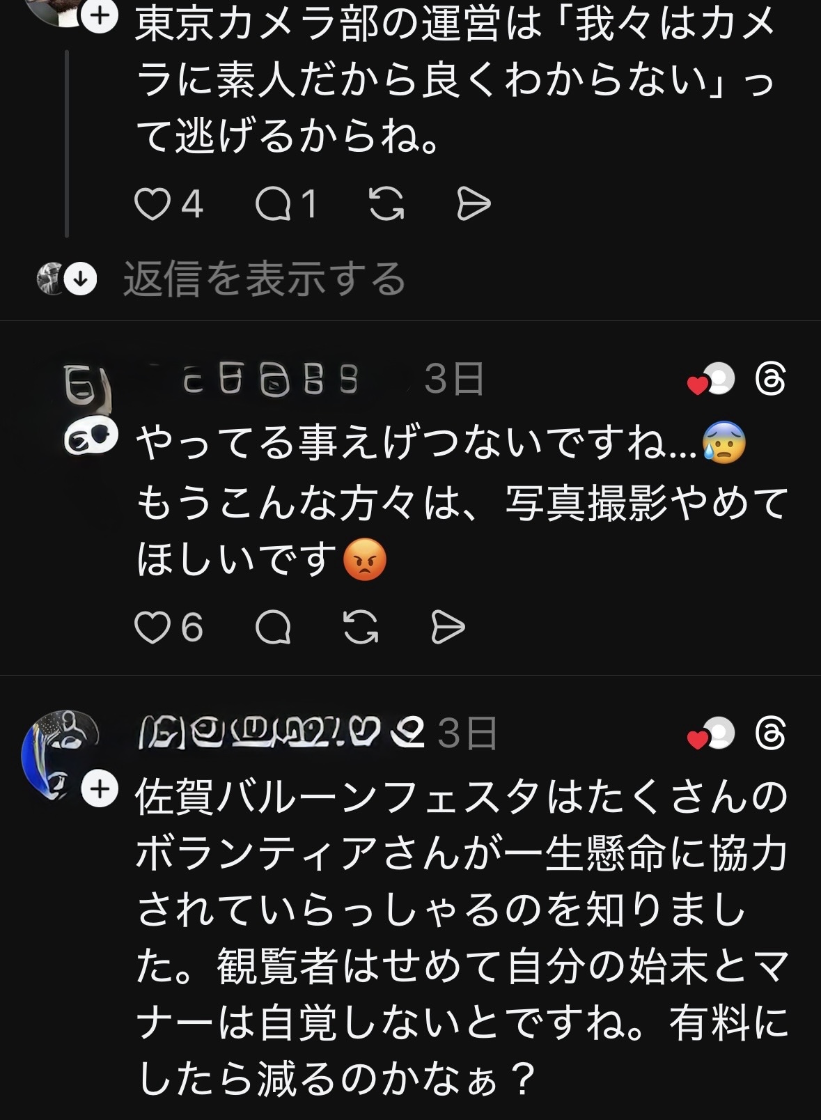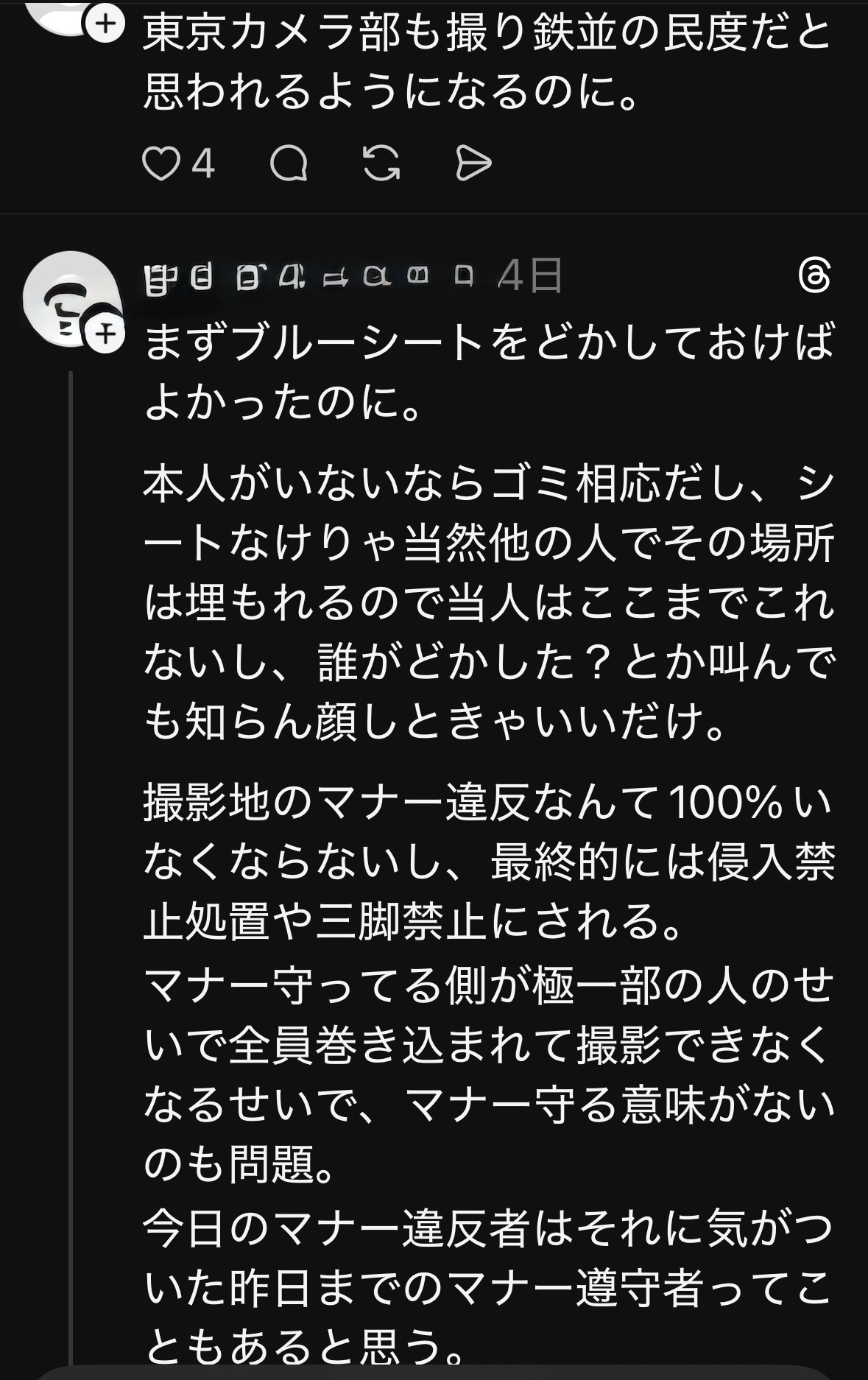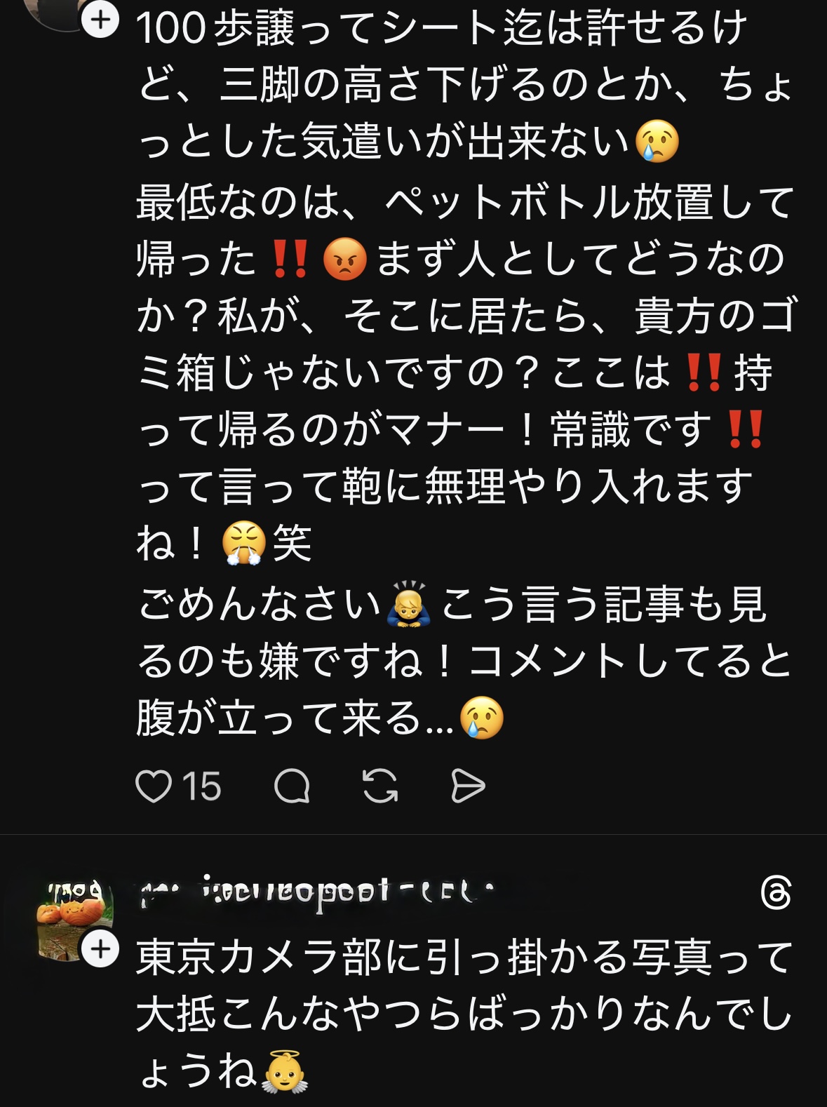 東京に帰宅した後にSNSを見ていると、なんと自分と全く同じ事を感じている投稿があり、これがまたマナー違反カメラマンに対し大炎上していました。SNSは発信されている事が前提の為、ここではその様子をスクリーンショットでお届けします。